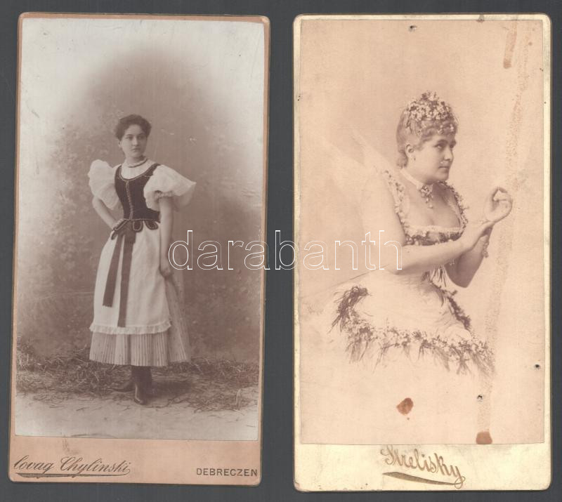 Description: cca 1895-1900 Feltehetően színésznők portréja, 2 db keményhátú fotó Strelisky budapesti és Chylinski György lovag (1859-1936) debreceni műterméből, kissé kopott, Strelisky foltos és rajszög ütötte lyukakkal, 20,5×11 cm