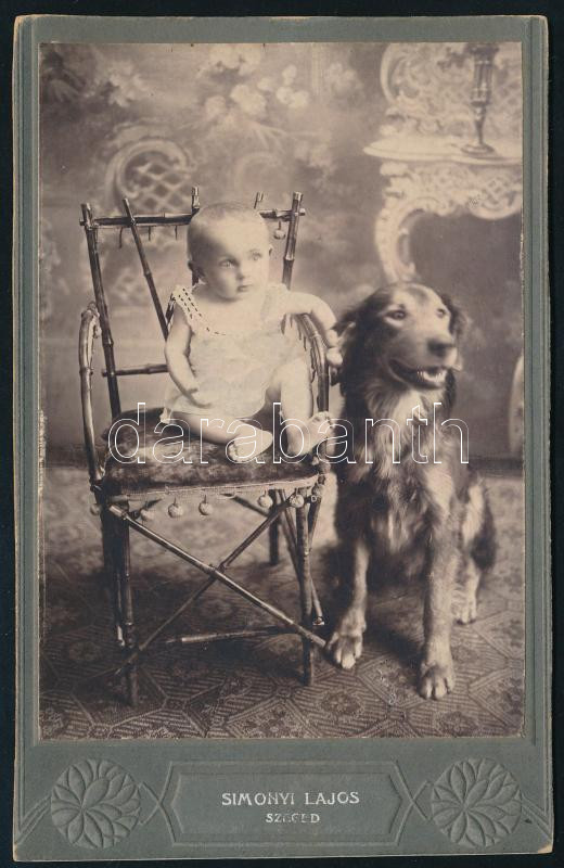 cca 1900 Gyerek kutyával, keményhátú fotó Simonyi Lajos szegedi műterm...