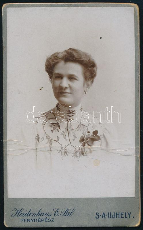 cca 1900 Hölgy portréja, Heidenhaus E. Pál sátoraljaújhelyi műterméből, 10,5×6,5 cm