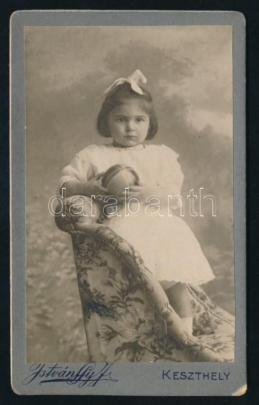cca 1900 Kislány portréja labdával, keményhátú fotó Istvánffy J. fényképész keszthelyi műterméből, 10,5x6,5 cm