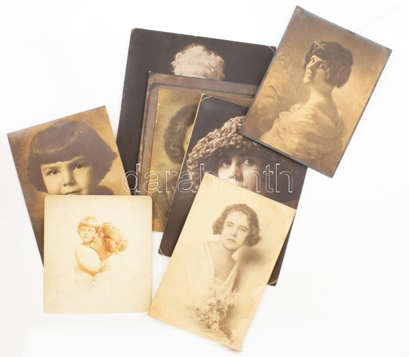 Description: cca 1905-1925 Művészi portrék hölgyekről, lányokról, feltehetőleg Röckel János Dénes budapesti fényképész felvételei, össz. 9 db fotó, változó állapotban, 17x14 cm és 29x21,5 cm között