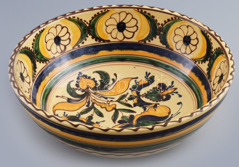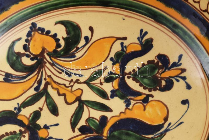 Szabó Kinga: Hódmezővásárhelyi dísztál, mázas kerámia, jelzett, alján kis lepattanással, d: 29 cm, m: 10 cm
