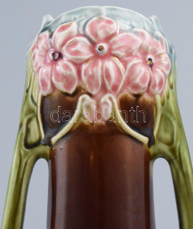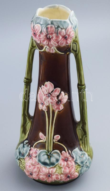 Szecessziós váza. Plasztikus virágmintákkal és inda fülekkel, sorszámozott, szájánál lepattanással és repedéssel, m: 28 cm
