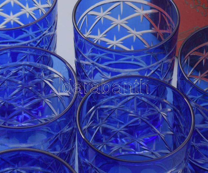 Dúsan csiszolt kristály kék likőrös pohár szett, 6 darab, eredeti dobo...