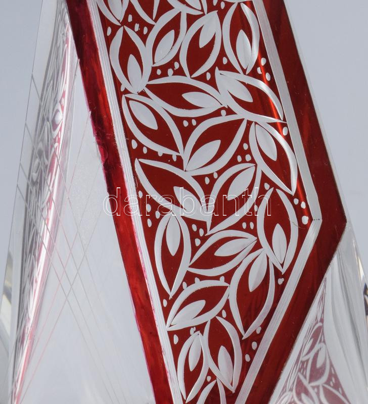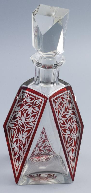 Karl Palda italos üveg. Dugóval, lapra csiszolt, bíborpácolt, köszörült mintás üveg, pattogzással, m: 27 cm
