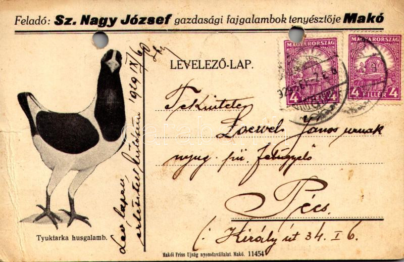 Description: 1929 Strasser gazdasági fajgalamb, Tyúktarka húsgalamb - Sz. Nagy József gazdasági fajgalambok tenyésztője Makón, reklám. Tulajdonos levele Loewel János pécsi nyug. pénzügyi felügyelőnek / Advertisement of a Hungarian pigeon breeder (lyukasztott / punched holes)