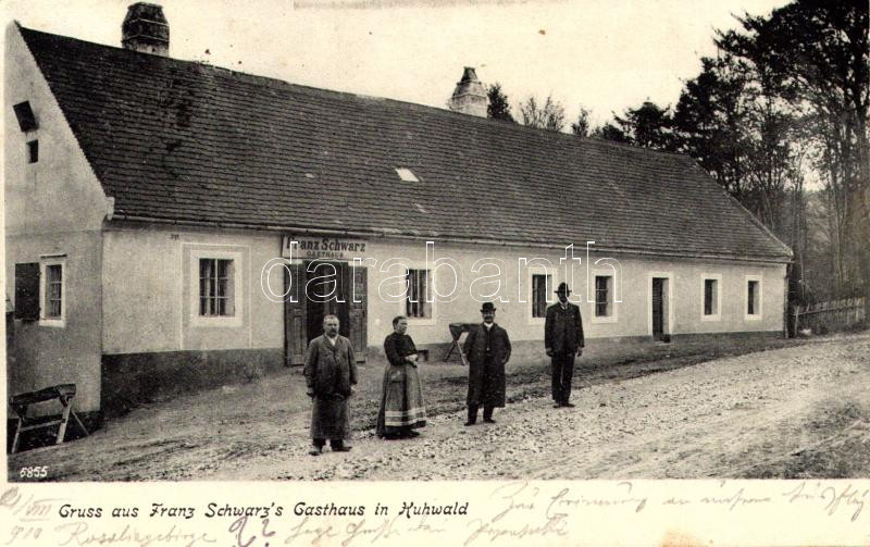 1910 Kuhwald (Rosaliengebirge), Gruss aus Franz Schwarz's Gasthaus / inn, restaurant (EK)