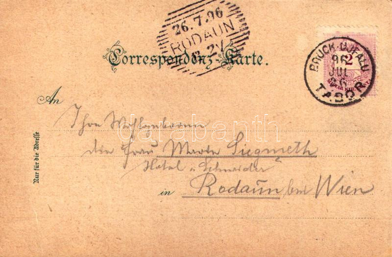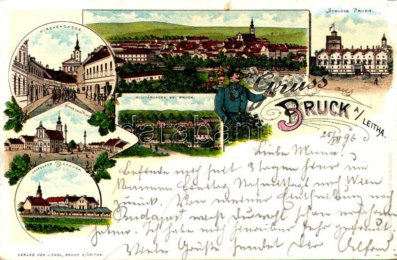 1896 (Vorläufer!!!) Lajtabruck, Bruck an der Leitha; Kirchengasse, Schloss Prugg, Kaiser Josef-Platz, Militärlager bei Bruck, Deutscher Bahnhof / Templom utca, Prugg kastély, Osztrák-magyar katonai tábor, vasútállomás. J. Sagl kiadása / street, castle, square, K.u.K. military barracks and camp, railway station. Karl Schwidernoch Art Nouveau, floral, litho (EB)