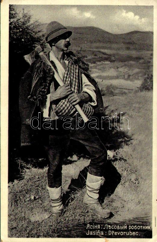 1941 Kőrösmező, Körösmező, Yasinia, Yasinya, Jaszinya, Jassinja, Jasina (Máramaros); Drevorubac / favágó / lumberjack, Transcarpathian folklore (szakadás / tear)