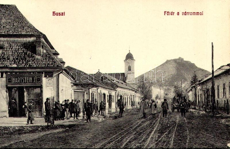 Huszt, Chust, Khust; Fő tér a várrommal, Hartstein J. üzlete. Auslände...