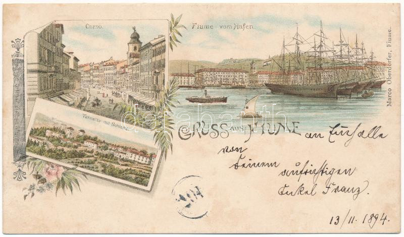 Description: 1894 (Vorläufer) Fiume, Rijeka; Corso, Hafen, Tersatto mit Schloss / port, Trsat with castle, street view. Marco Oberdorfer Art Nouveau, floral, litho (fl)