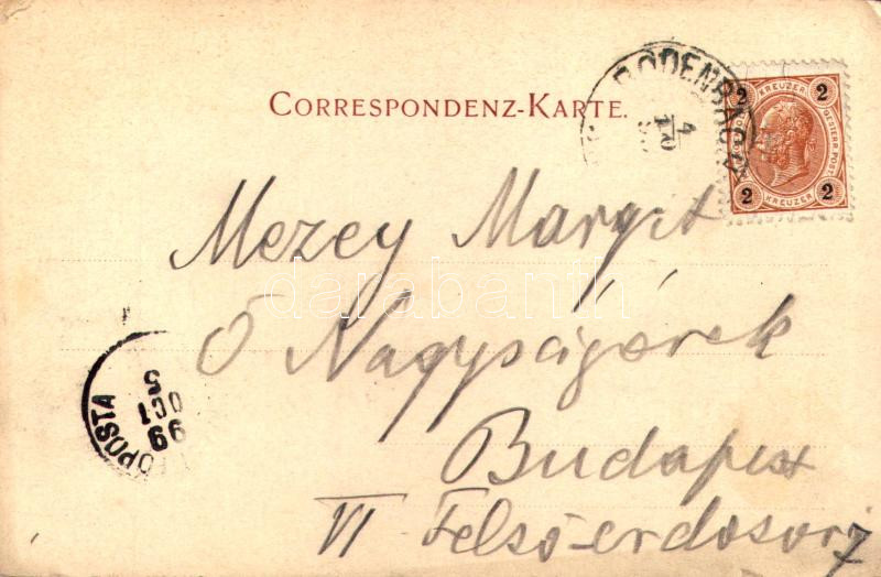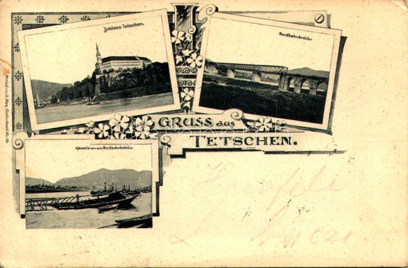 Description: 1899 (Vorläufer) Decín, Tetschen; Schloss Tetschen, Nordbahnbrücke, Havarie an der Nordbahnbrücke / castle, railway bridge, accident at the northern railway bridge. Art Nouveau, floral (small tear)