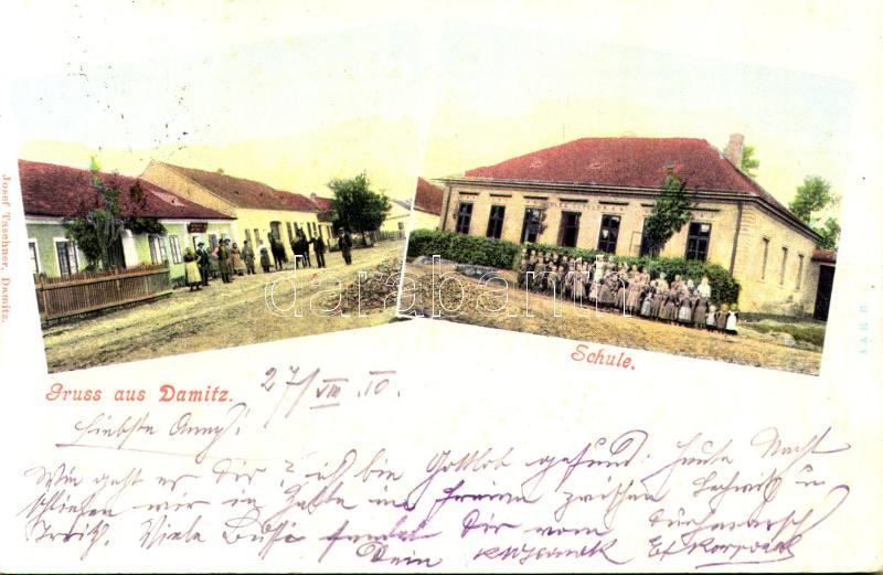 1910 Damnice, Damitz; Schule / street view with shop, school. Josef Ta...