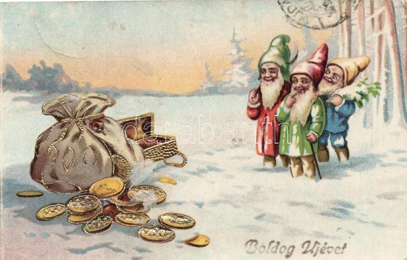 New Year, dwarves, coins, golden decoration litho (gluemark)