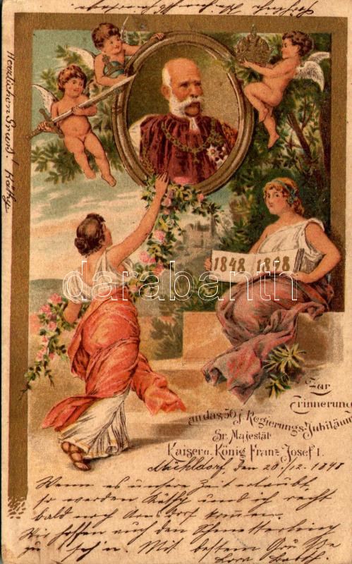 Description: 1898 (Vorläufer) Zur Erinnerung an das 50 j. Regierungs-Jubiläum Sr. Majestät Kaiser u. König Franz Josef I 1848-1898 / I. Ferenc József uralkodásának 50. évfordulója alkalmából / Franz Joseph's 50th anniversary of reign. Art Nouveau, litho (EK)