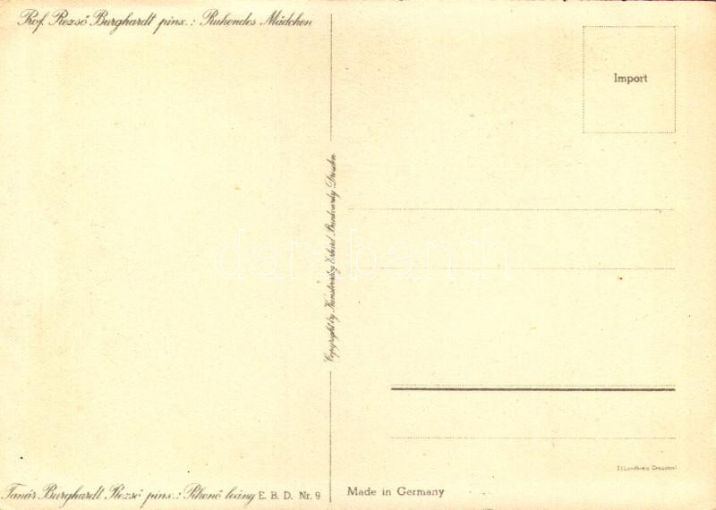 Pihenő lány / Ruhendes Mädchen. Kunstverlag Erhard Bunkowsky Dresden Nr. 9. s: Tanár Burghardt Rezső (EK)