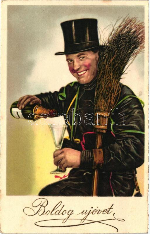 New Year, Chimney sweeper with bottle and glass of champagne, Paul Pit...