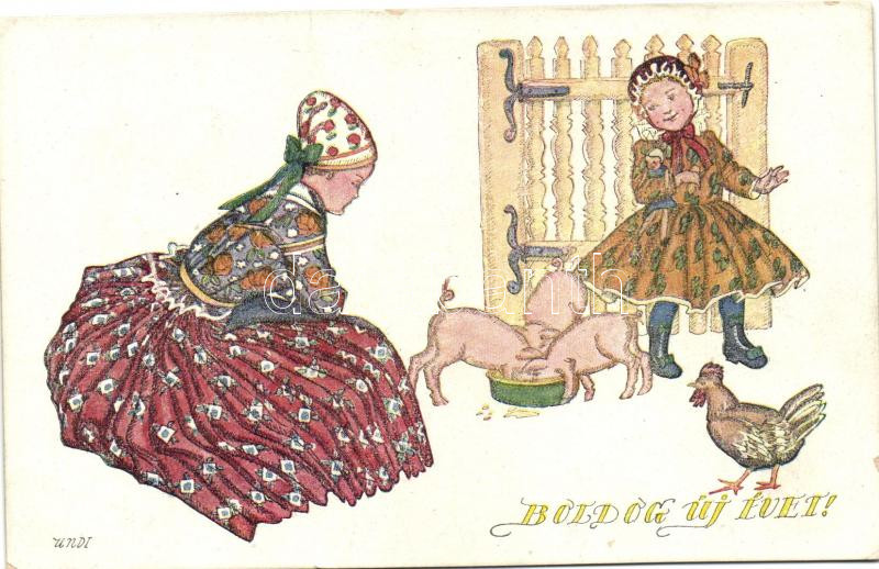 Újév, Országos Anya és Csecsemővédő Egyesület kiadása 931. / New Year, Hungarian folklore s: Undi
