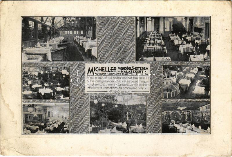 Budapest VIII. Micheller vendéglő, étterem, halászkert, belsők. Práter u. 42. Reklámlap (EB)
