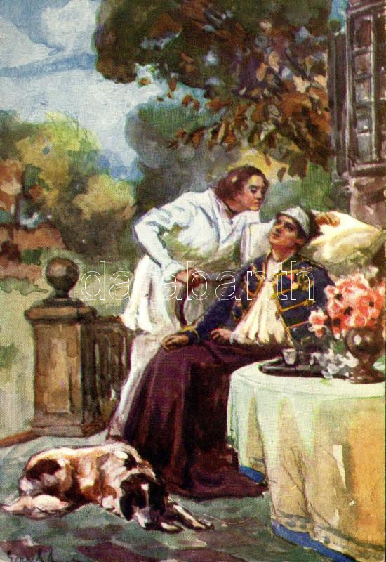 Description: 1915 Visszatért hős / Der verwundete Held / WWI Austro-Hungarian K.u.K. military art postcard, injured soldier at home. Rotophot Budapest Nr. 654. s: Gergely (EK)