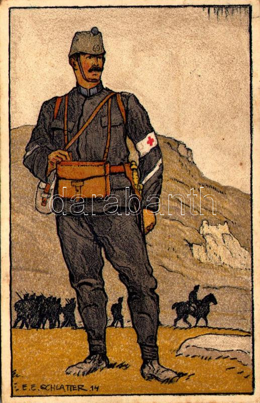 Description: 1916 Feldpostkarte Schweizerische Grenzbesetzung. Sanitäts-Gefreiter-Appointé Sanitaire. Graph. Wekrstatten Gebr. Fretz / WWI Swiss military art postcard, field medic s: E. E. Schlatter (Rb)