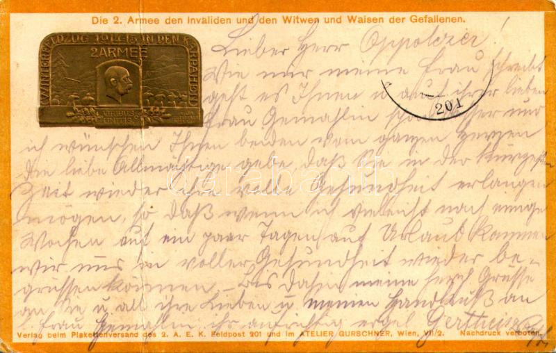 Description: 1916 Winterfeldzug 1914-15 in den Karpathen. Viribus Unitis. Die 2. Armee den Invaliden und den Witwen und Waisen der Gefallenen. Feldpostkarte / WWI Austro-Hungarian K.u.K. military badge on a field postcard. Emb. + "Rechnungskontrollabtg. der Quartiermeisterabtg. des k.u.k. 2. A.K." (fa)