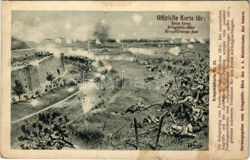 Kriegsbildkarte Nr. 23. Die Belagerung von Przemysl, Anfang Oktober 1914: Die russischen Angriffe an die Außenforts der Festung werden von unserer Festungsartillerie und vorgeschobenen Besatzungstruppe unter ungeheuer schweren Verlusten für den Feind zurückgeschlagen. Kriegshilfsbüro / WWI Austro-Hungarian K.u.K. military art postcard. The Siege of Przemysl, early October 1914: The Russian attacks on the fort's outer walls are being repulsed by our fortress artillery and advanced occupation force, with tremendous losses for the enemy s: M. Ledeli (fl)