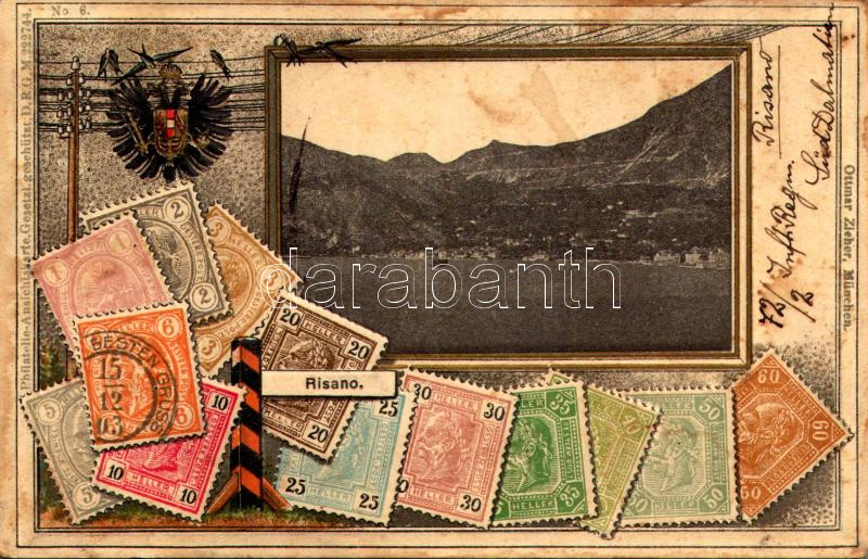 Risan, Risano; Set of Austrian (Austro-Hungarian) stamps with coat of arms. Ottmar Zieher Philatelie-Ansichtskarte No. 6. Emb. litho (pinhole)