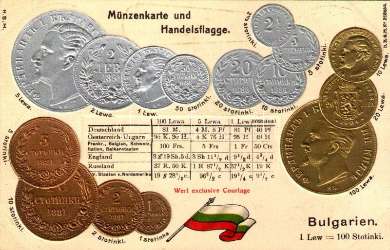 Bulgarien. Münzenkarte und Handelsflagge / Bulgaria - set of coins, currency exchange chart and flag. H.S.M. Emb. litho (lyuk / pinhole)