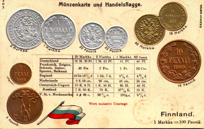 Finnland. Münzenkarte und Handelsflagge / Finland - set of coins, currency exchange chart and flag. H.S.M. Emb. litho (lyuk / pinhole)