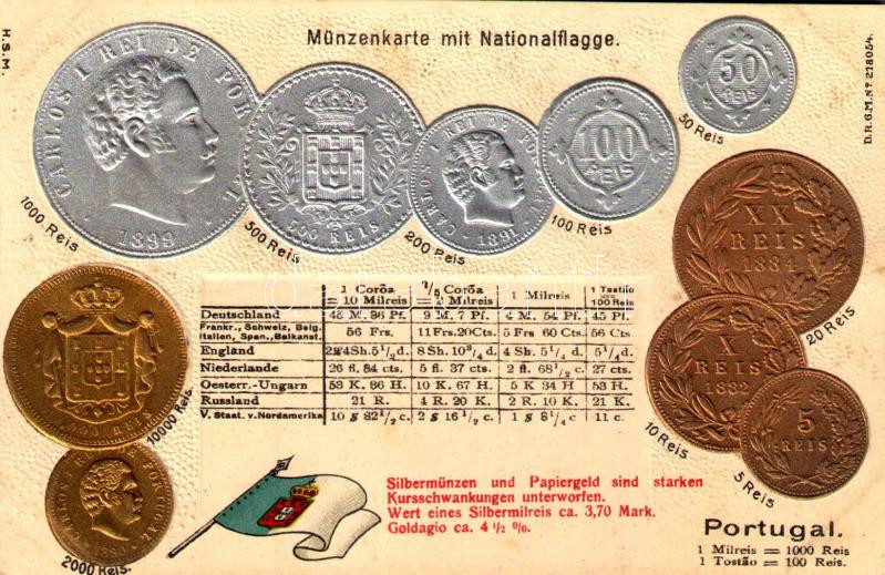 Portugal. Münzenkarte und Nationalflagge / Portuguese set of coins, currency exchange chart and flag. H.S.M. Emb. litho (lyuk / pinhole)