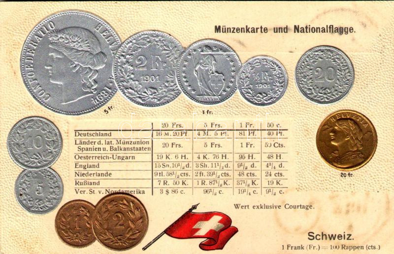 Schweiz. Münzenkarte und Nationalflagge / Swiss set of coins, currency exchange chart and flag. Emb. litho (lyuk / pinhole)