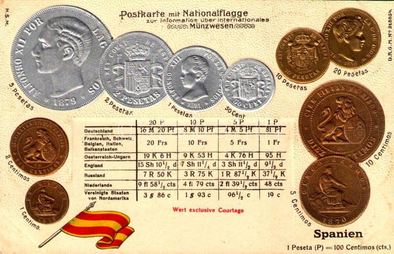 Spanien. Postkarte mit Nationalflagge / Spanish set of coins, currency exchange chart and flag. H.S.M. Emb. litho (lyukak / pinholes)