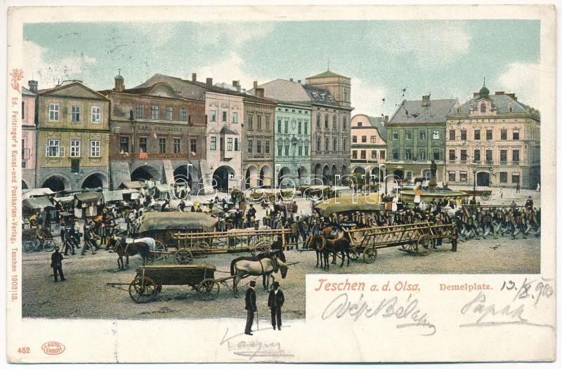 https://www.darabanth.com/en/471-Online-auction/471.0/Postcards/Poland~2000071/1903-Cieszyn-Teschen-Demelplatz-square-market-shop-of-Karl-Prochaska-Ed-Feitzingers-Kunst-~II3188786
