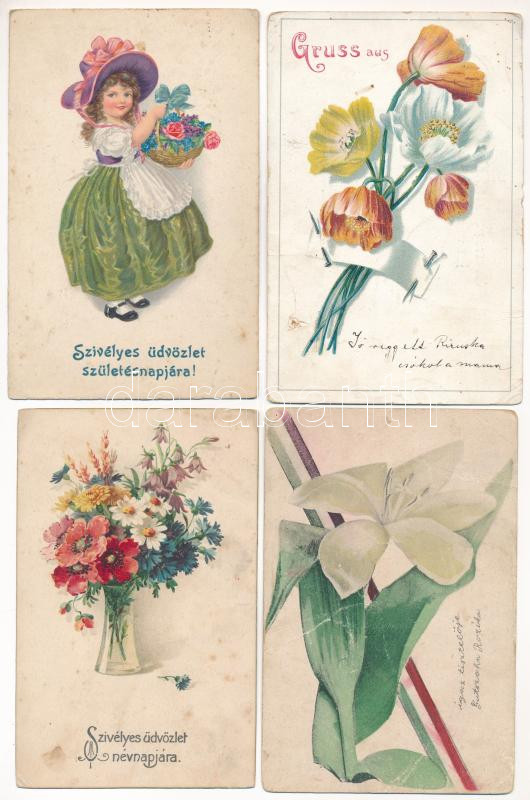 21 db RÉGI virágos üdvözlő képeslap vegyes minőségben / 21 pre-1945 flower greeting postcards in mixed quality