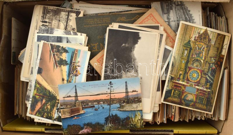 Kb. 2400 db főleg RÉGI francia képeslap dobozban, vegyes minőség / Cca. 2400 mostly pre-1950 French postcards in a box, mixed quality
