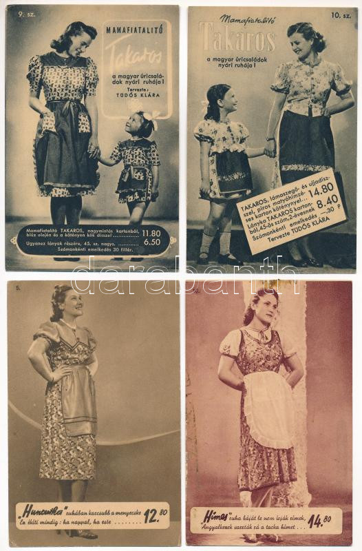 Description: Magyar Divatcsarnok. Budapest VII. Rákóczi út 70-76. - 7 db régi használatlan reklám képeslap ruhákkal / 7 pre-1945 Hungarian fashion shop advertisement postcards
