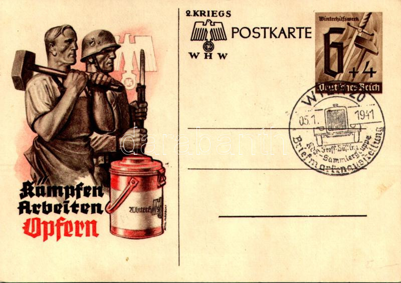 Kämpfen Arbeiten Opfern. Winterhilfswerk 2. Kriegs WHW / "Fight, work, sacrifice" NSDAP German Nazi Party working class, labor propaganda, swastika; 6+4 Ga. s: Atel. Albrecht + "1941 Wien Briefmarkenausstellung" So. Stpl