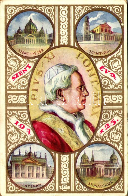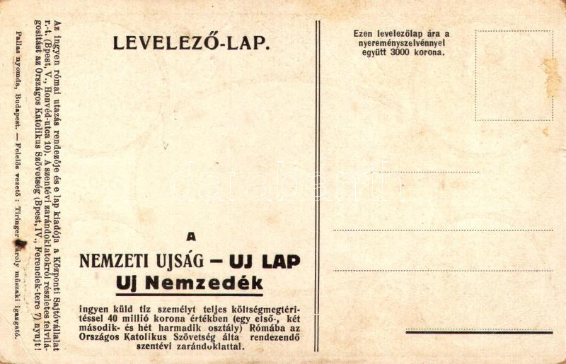 Description: 1925 Pius XI Pont. Max. Szent Év Magyarok Nemzeti zarándoklata Rómába. A Nemzeti Újság ingyenes római utazás nyereményjátéka / Hungarian National Pilgrimage to Rome. Trip prize advertisement on the backside s: Tábor (EB)