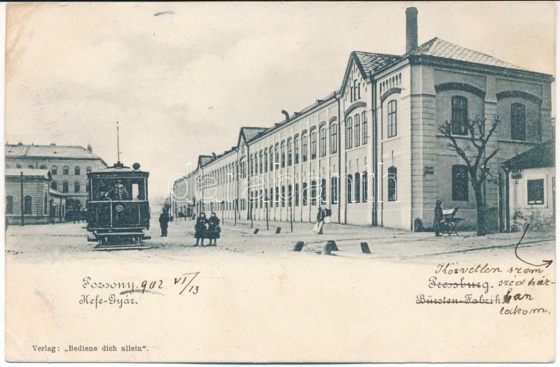 1902 Pozsony, Pressburg, Bratislava; Kefegyár, villamos. Verlag Bediene dich allein / Bürsten-Fabrik / brush factory, tram (EK)
