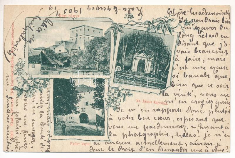 Description: 1903 Besztercebánya, Banská Bystrica; Régi bástya, Ezüst kapu, Szent János kápolna. Ivánszky Elek kiadása / bastion tower, city gate, chapel. Art Nouveau, floral (EB)