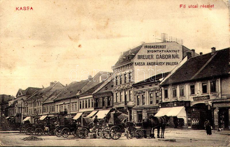 1914 Kassa, Kosice; Fő utca, lovashintók, Breuer Gábor Andrássy Palota... https://www.darabanth.com/en/471-Online-auction/471.0/Postcards/Slovakia~2000007/1914-Kassa-Kosice-Fo-utca-lovashintok-Breuer-Gabor-Andrassy-Palota-reklam-Berkovits-Jozse~II3185239