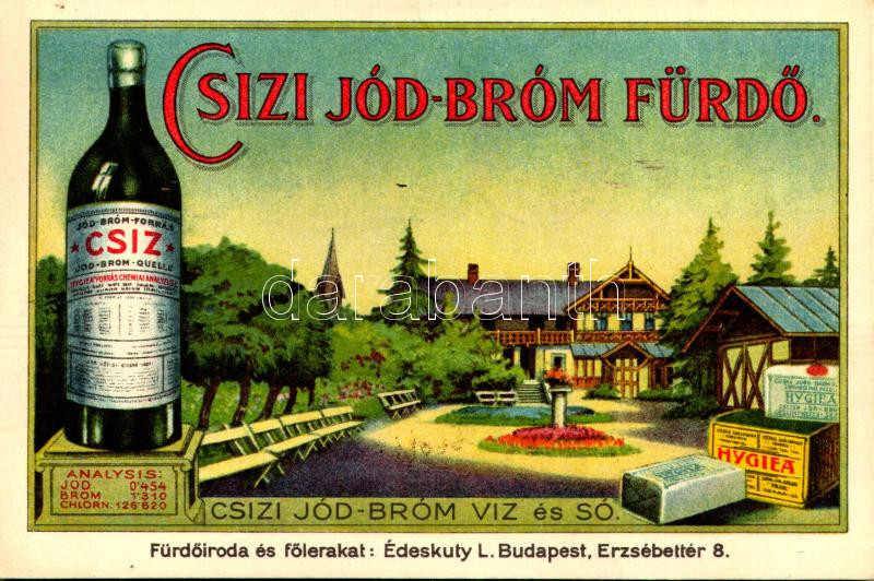 1930 Csíz, Csízfürdő, Kúpele Cíz; Jodové Lázne Cíz, Cízská Jodová Voda a Soli / Csízi Jód-bróm-fürdő, forrásvíz és só reklámlap / Iodine-bromine spa advertisement