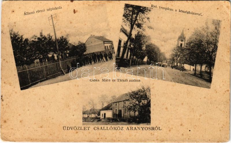 Description: 1940 Csallóközaranyos, Aranyos, Zlatná na Ostrove; Állami elemi népiskola, Református templom, Községháza, Csóka Máté és Társai malom / school, Calvinist church, town hall, mill (fl)