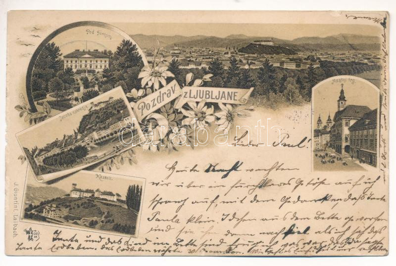 1898 (Vorläufer) Ljubljana, Laibach; Pod Turnom, Mestni trg, Kastell, ... https://www.darabanth.com/en/471-Online-auction/471.0/Postcards/Slovenia~2000098/1898-Vorlaufer-Ljubljana-Laibach-Pod-Turnom-Mestni-trg-Kastell-Jacoba-nabrezje-J-Giontini-~II3189270