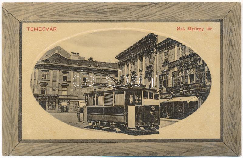 Temesvár, Timisoara; Belváros, Szent György tér, Farber Miksa, Szeibert Péter, Klein, Berger Ármin üzlete, Országos Korona Takarékpénztár, villamos, Áruház az angol szabóhoz. Kiadja Gerő Manó / square, shops, savings bank, tram (EK)