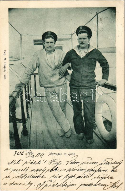 Description: 1904 K.u.K. Kriegsmarine S.M.S Taurus Stationsschiff, Matrosen in Ruhe / SMS TAURUS (később Marechiaro) cs. és kir. haditengerészeti állomáshajó matrózai mezítlábasan a fedélzeten / SMS Taurus Austro-Hungarian Navy station ship's mariners on deck. Dep. M. Clapis Pola