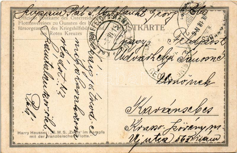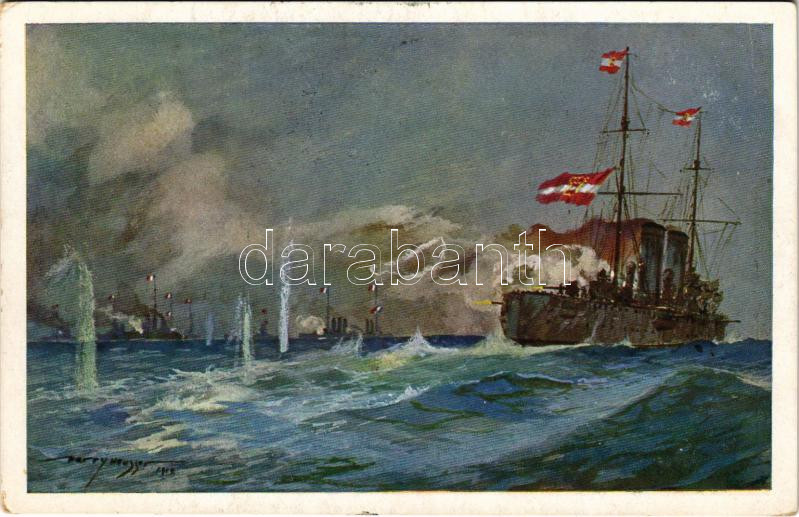1915 SMS Zenta im Kampfe mit der französischen Flotte. K.u.K. Kriegsmarine. Offizielle Postkarte des Österreichischen Flottenvereines zu Gunsten des Kriegsfürsorgeamtes des Kriegshilfsbüros und des Roten Kreuzes / Az Osztrák-Magyar Haditengerészet SMS Zenta védett cirkálója csatában a francia flottával / WWI Austro-Hungarian Navy art postcard, SMS Zenta protected cruiser in battle with the French fleet s: Harry Heusser + "K.U.K. KRIEGSMARINE SMS SANKT GEORG" (EK)