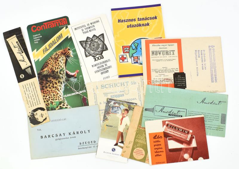 11 db vegyes gyógyszerészeti témájú reklám és nyomtatvány, közte a Mar...