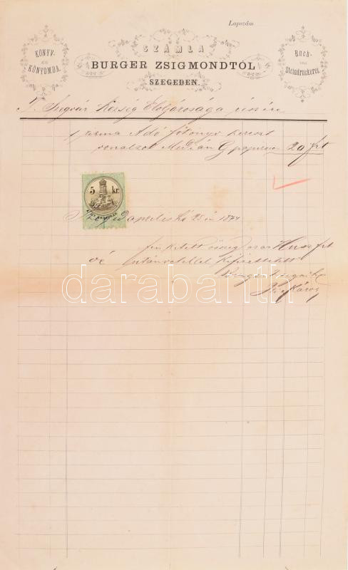 1874 Burger Zsigmond könyv- és kőnyomda fejléces számla.